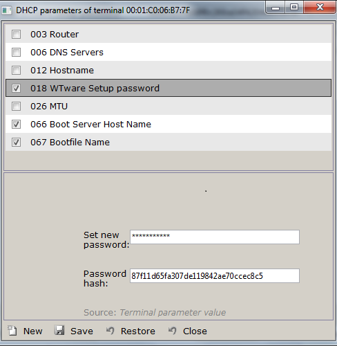 Using Setup menu you can install WTware on a hard disk (all disk data will be lost) or reconfigure terminal parmeters. If you want users to have no access to this menu set password. Unfortunately, this password can't be just set in configuration file, for during terminal load terminal haven't jet downloaded its configurtion file. This password should be specified in 018 DHCP (Extensions Path) parameter. We don't know any system/device/progam except WTware, tha uses this parameter value. You can easily specify this parameter: all other computers in the network will ignore it. This parameter value is distributed to all network computers, so password shouldn't be specified directly in dhcp parameter. Instead of password set parameter value to password hash-function, that is calculated by WTware setup password utility in configurator: