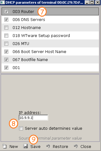 Select from DHCP parameters list 003 parameter, Router (7). Untick autodetermine checkbox for router