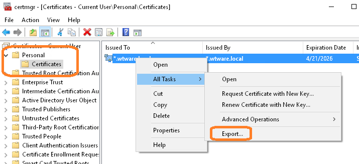 Certificate is released for *.wtware.local. Configure DNS so that terminals' names were in this zone.
