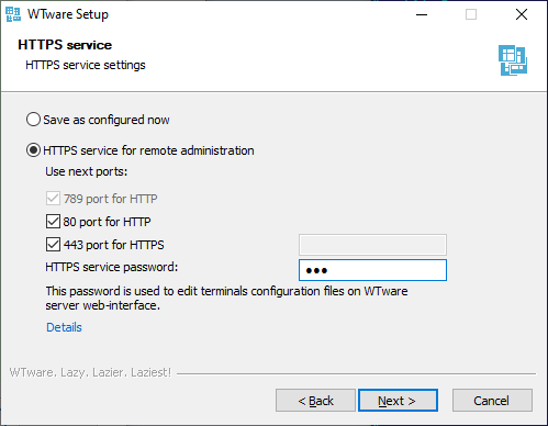 HTTPS protocol is made for real servers. And these servers have previously known names. Needed for HTTPS encryption certificated are bound to server name or IP address. But we don't know neither names nor addresses of your WTware terminals.