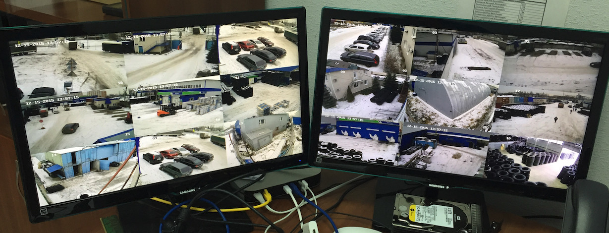 Two 1920x1080 monitors with nine security cameras on each: